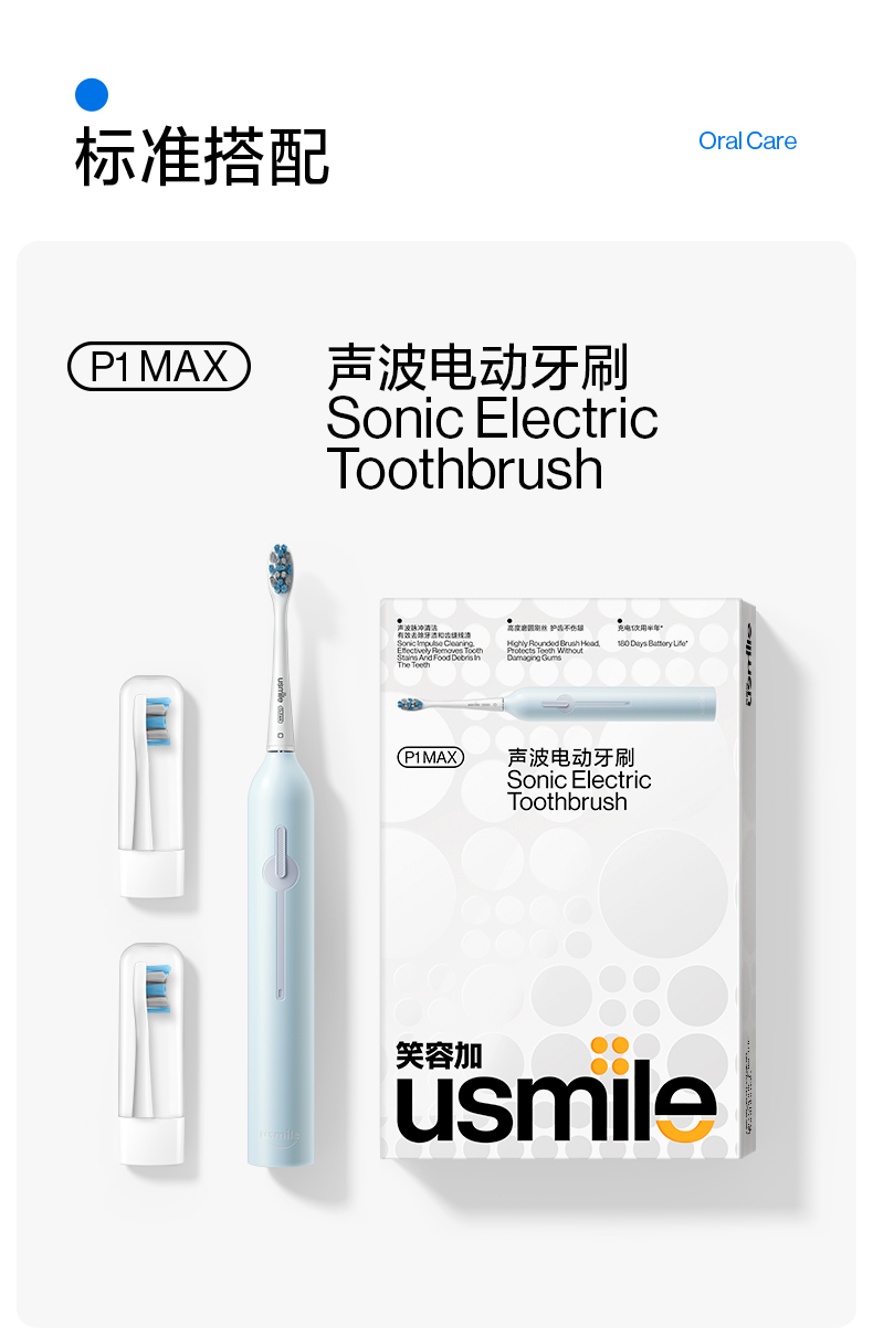 代发usmile 笑容加电动牙刷 P1MAX 精灵蓝 声波软毛 IPX7 防水成人充电款牙刷